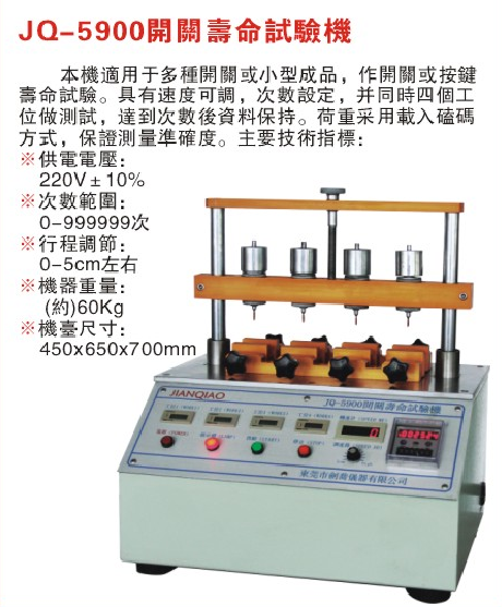 产品型号:JQ-5900 品牌:剑 乔 用途:一、产品介绍: 本机可对计算机、手机、记事本等到键盘作寿命测试。适用于多种开关或小型成品,作开关或按键寿命试验,具有速度可调、次数设定,并达到次数后数据保持. 二、主