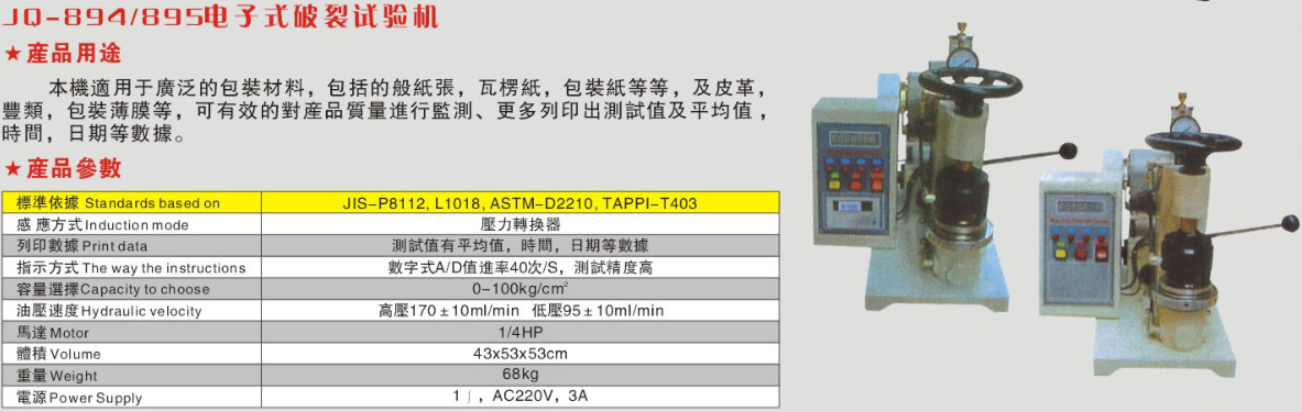 本仪器之设计符合ISO2759《纸板耐破度的测定》和GB/T1539《纸板的测定法》之标准要求。适用于以瓦楞纸包装之制鞋、电子、电线、电器、五金、自行车、手提包、食品、家具等工厂,检验纸箱之抗破裂强度。亦可测试成皮﹑布类。采用讯号传输压力,试料破裂时自动保留最大破裂强度值。