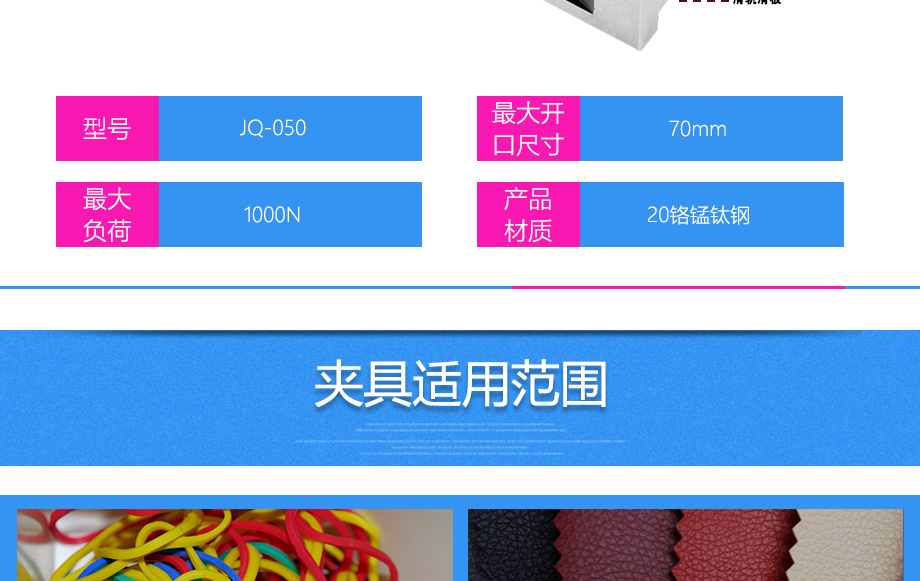 产品型号:JQ-050 品牌:剑 乔 用途:平口钳夹具适用范围:橡胶、各种线缆、纸、各种电器元件、塑料薄膜等材料的拉力,破坏力测试。