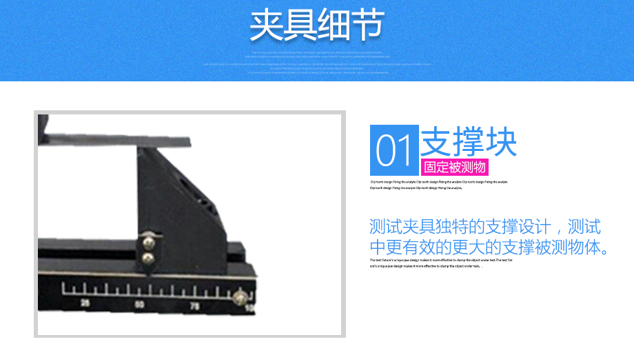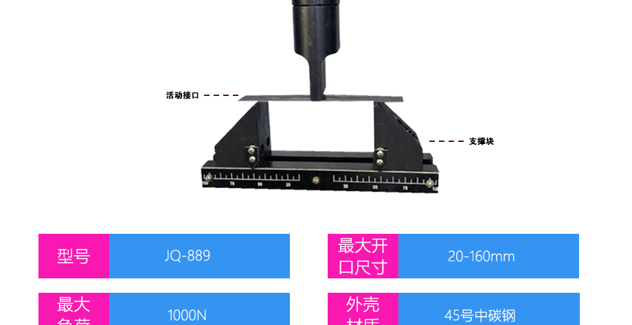 产品型号:JQ-889 品牌:剑 乔 用途:三点弯曲夹具适用范围:钢材、板材等材料的拉力,破坏力测试。