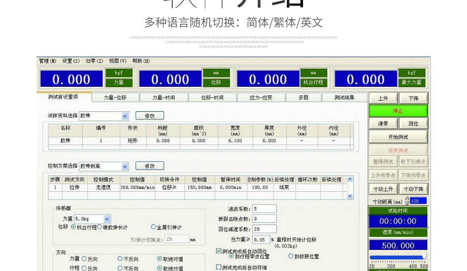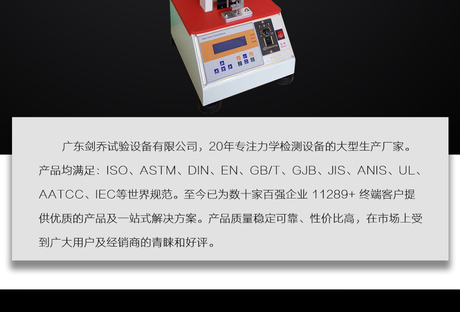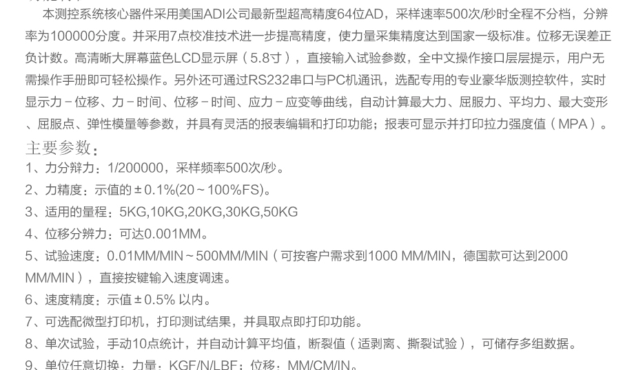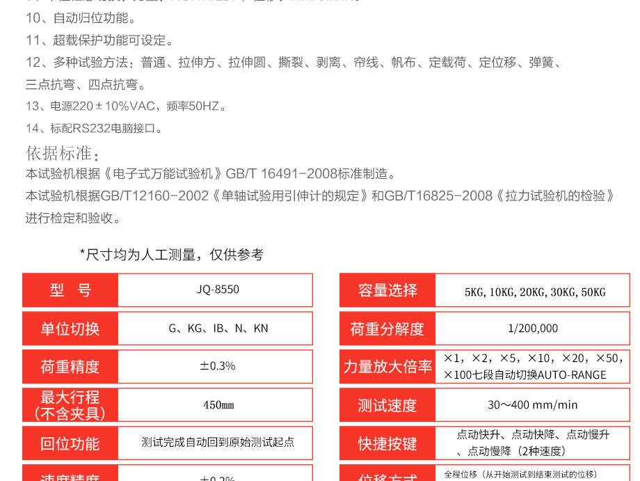 产品型号:JQ-8550 品牌:剑 乔 用途:本系列机广泛用于各类薄膜、五金、橡胶料、纺织、建材、绝缘体、电线、电缆、端子等各类材料。测试其拉伸、撕裂、穿刺、剥离、抗压、弯曲、抗剪切、定荷重、定位移、三点抗折