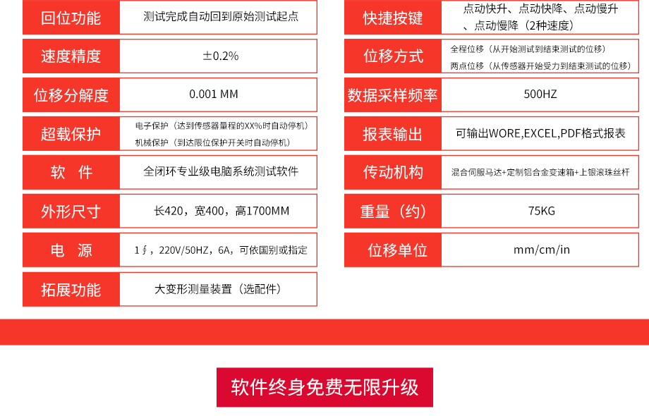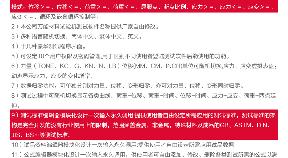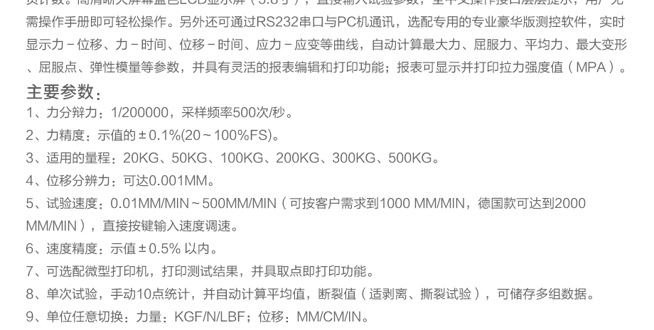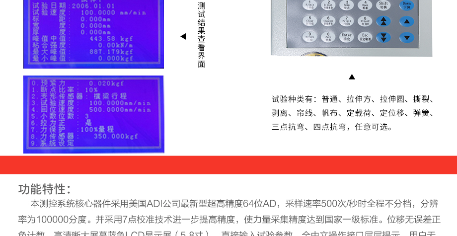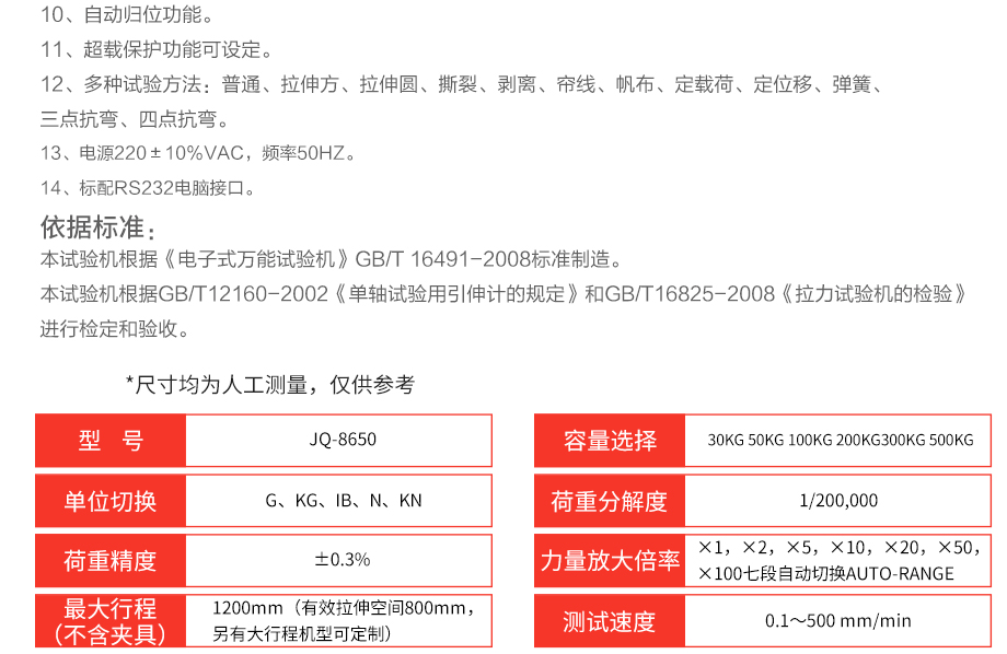 产品型号:JQ-8650 品牌:剑 乔 用途:本系列机广泛用于各类五金、橡胶制品、鞋类、皮革、服装、纺织、建材、绝缘体、电线、电缆、端子等各类材料。测试其拉伸、撕裂、剥离、抗压、弯曲、抗剪切、定荷重、定位移、