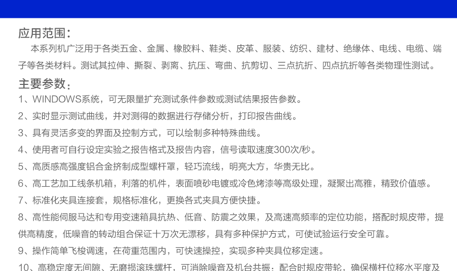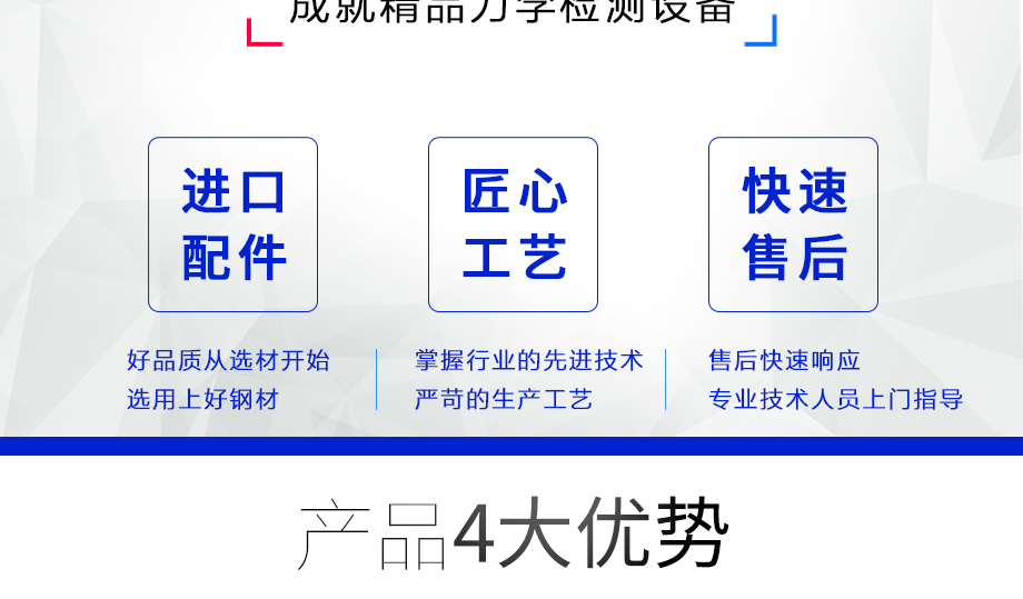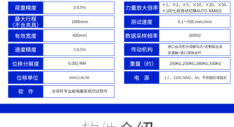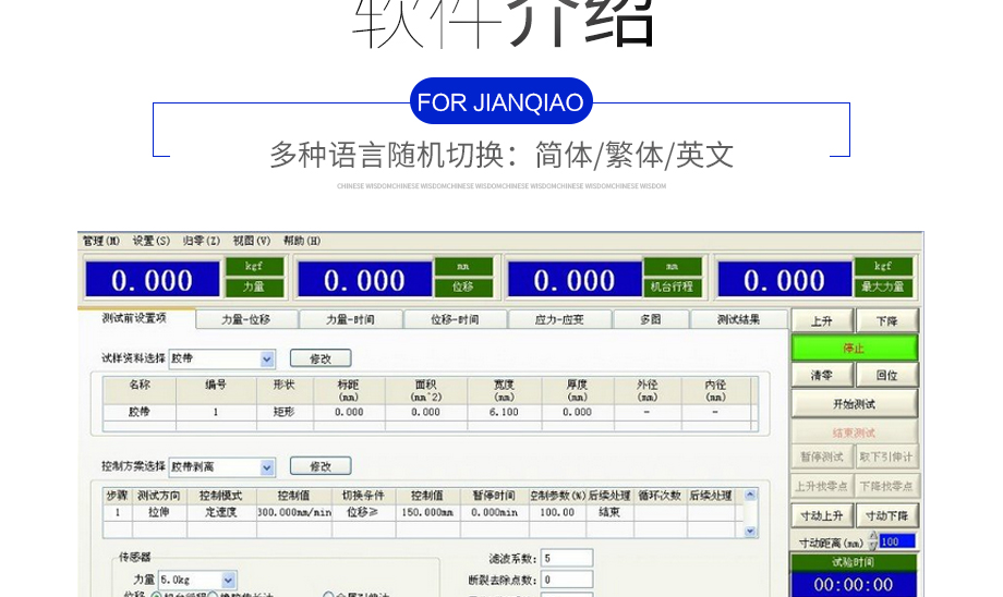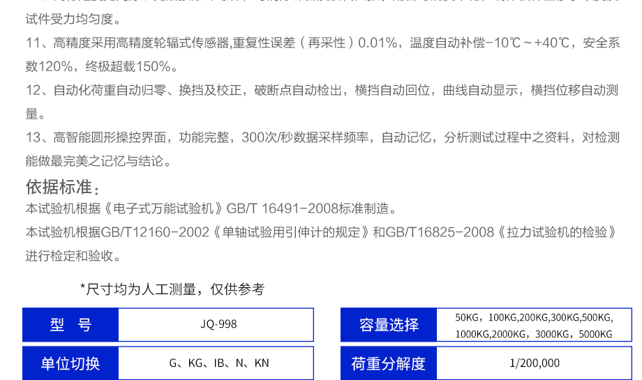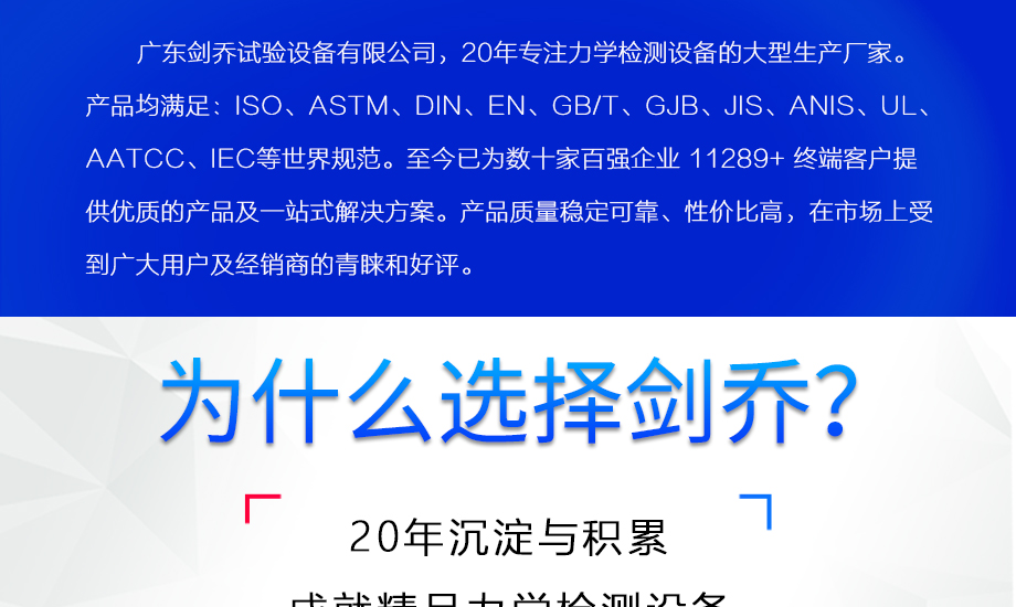 产品型号:JQ-998(高端定制款) 品牌:剑 乔 用途:高端双柱拉力机主要测试原物料、成品、半成品的物理特性,可做抗拉力测试、抗压力测试、抗弯测试,取得伸长量、伸长率、应力、应变等测试结果及测试资料。